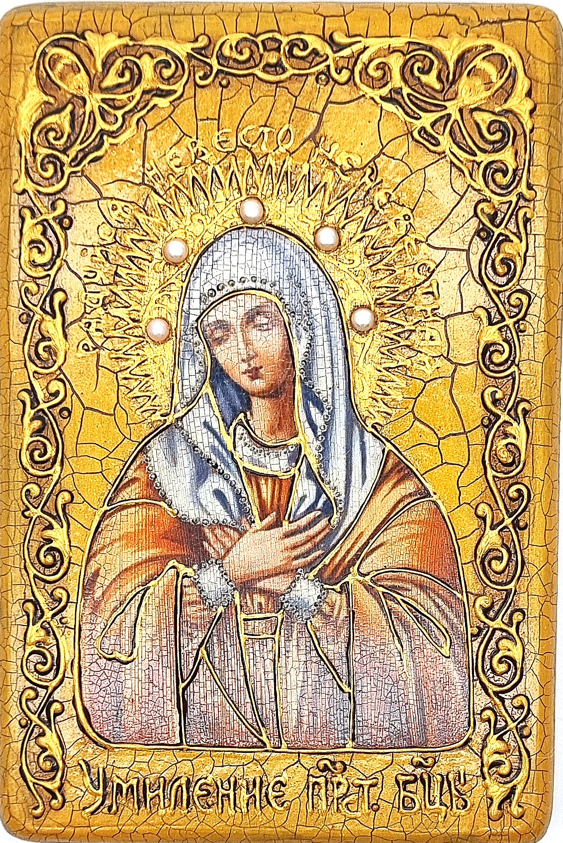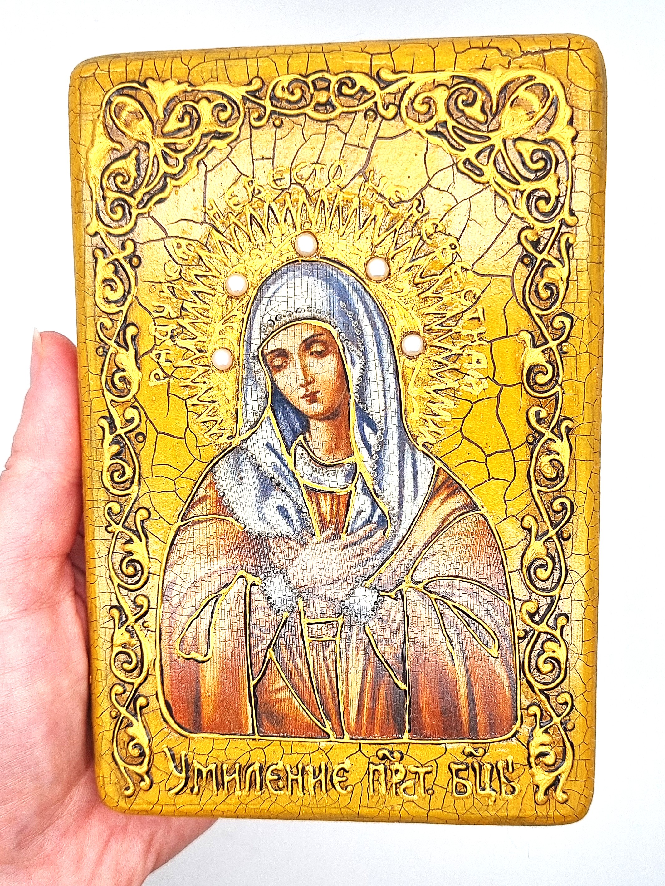 Лик создан с авторского списка методом, получившим одобрение Русской Православной Церкви. В процессе оформления мастера используют специальные фронтажные грунты, выравнивающие лаки и темперные краски, что позволяет добиться глубины и чистоты изображения. Особую ценность иконе придает ручная отделка: венец и поля украшены изысканным рельефным орнаментом и инкрустированы натуральными камнями.