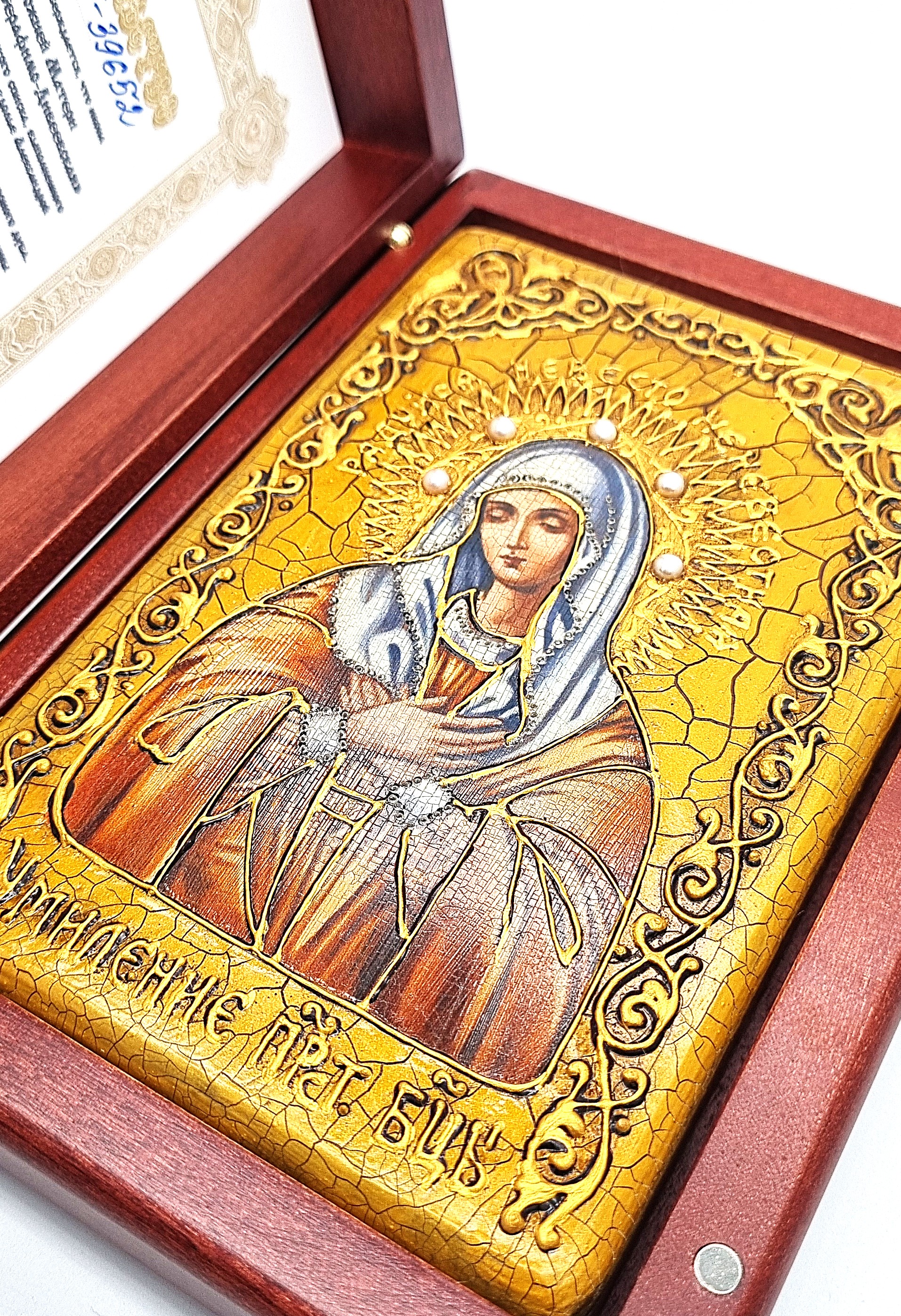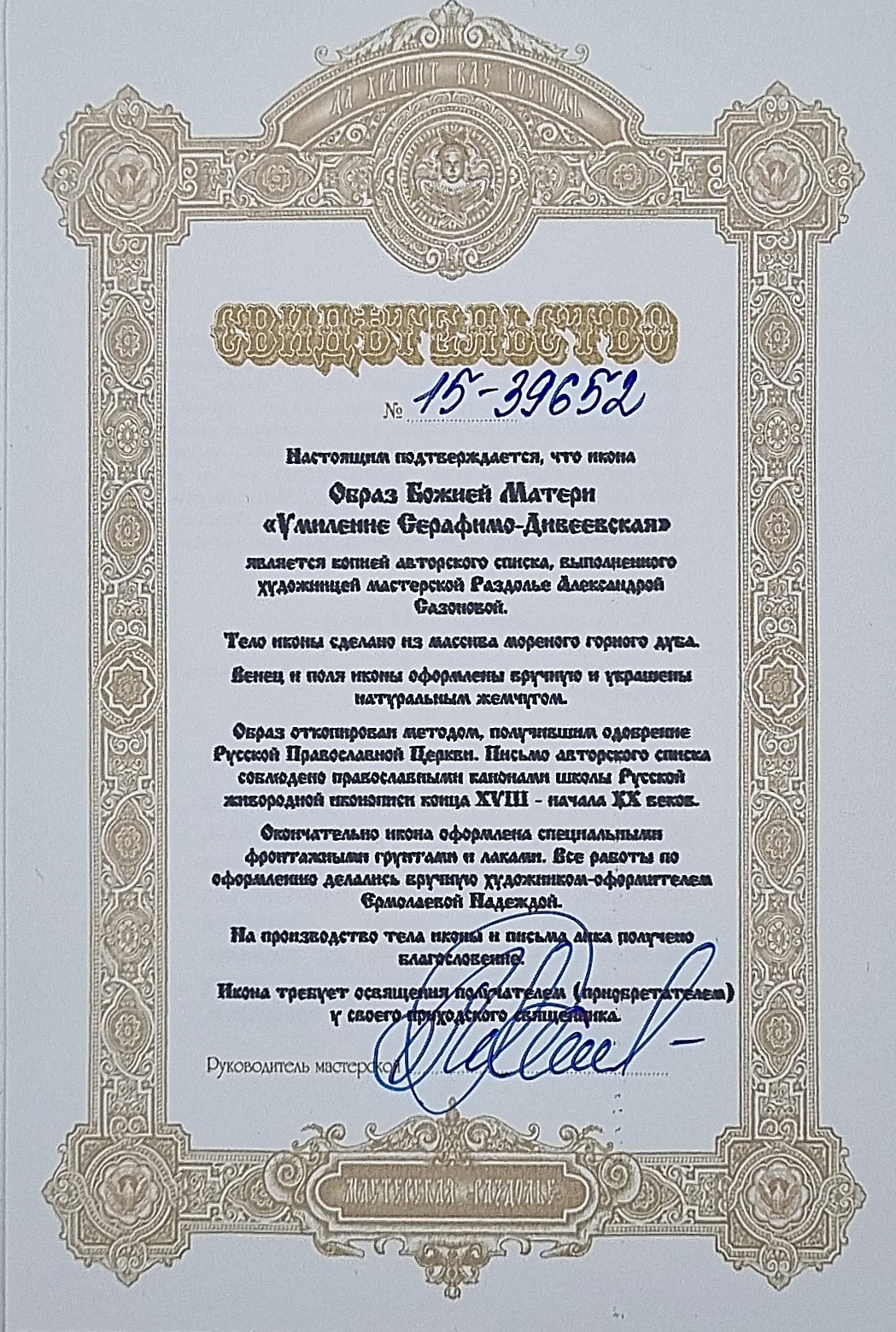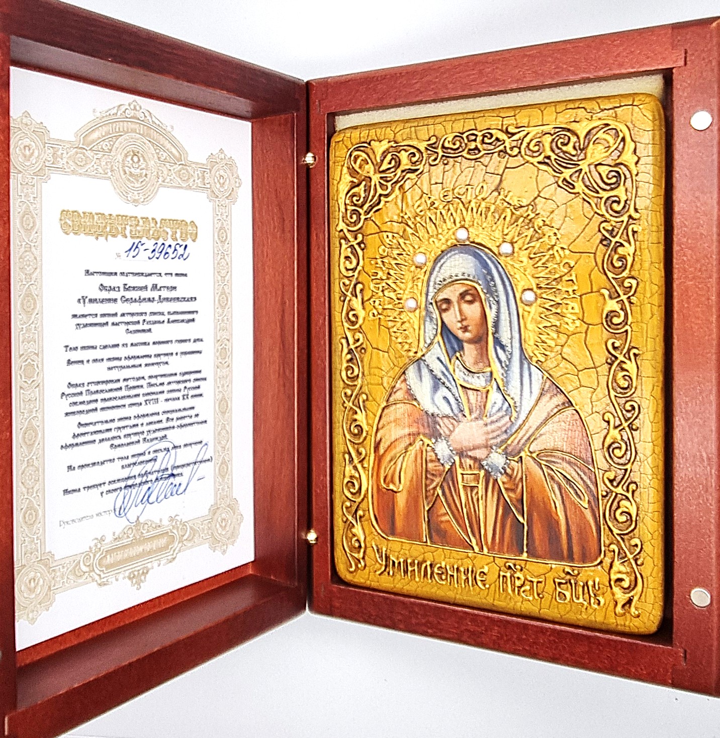 К каждой иконе прилагается номерное свидетельство с подробной информацией об изделии;