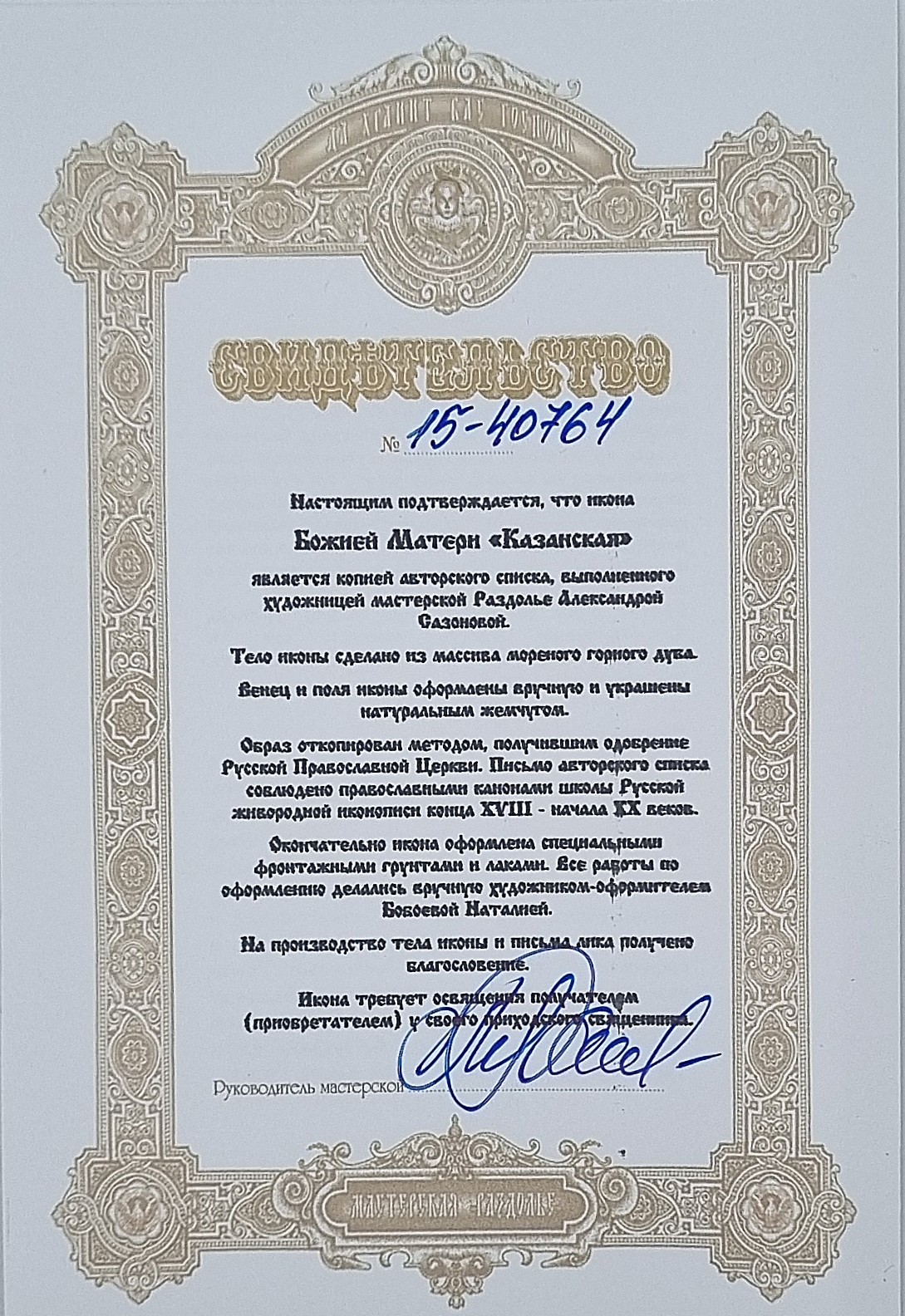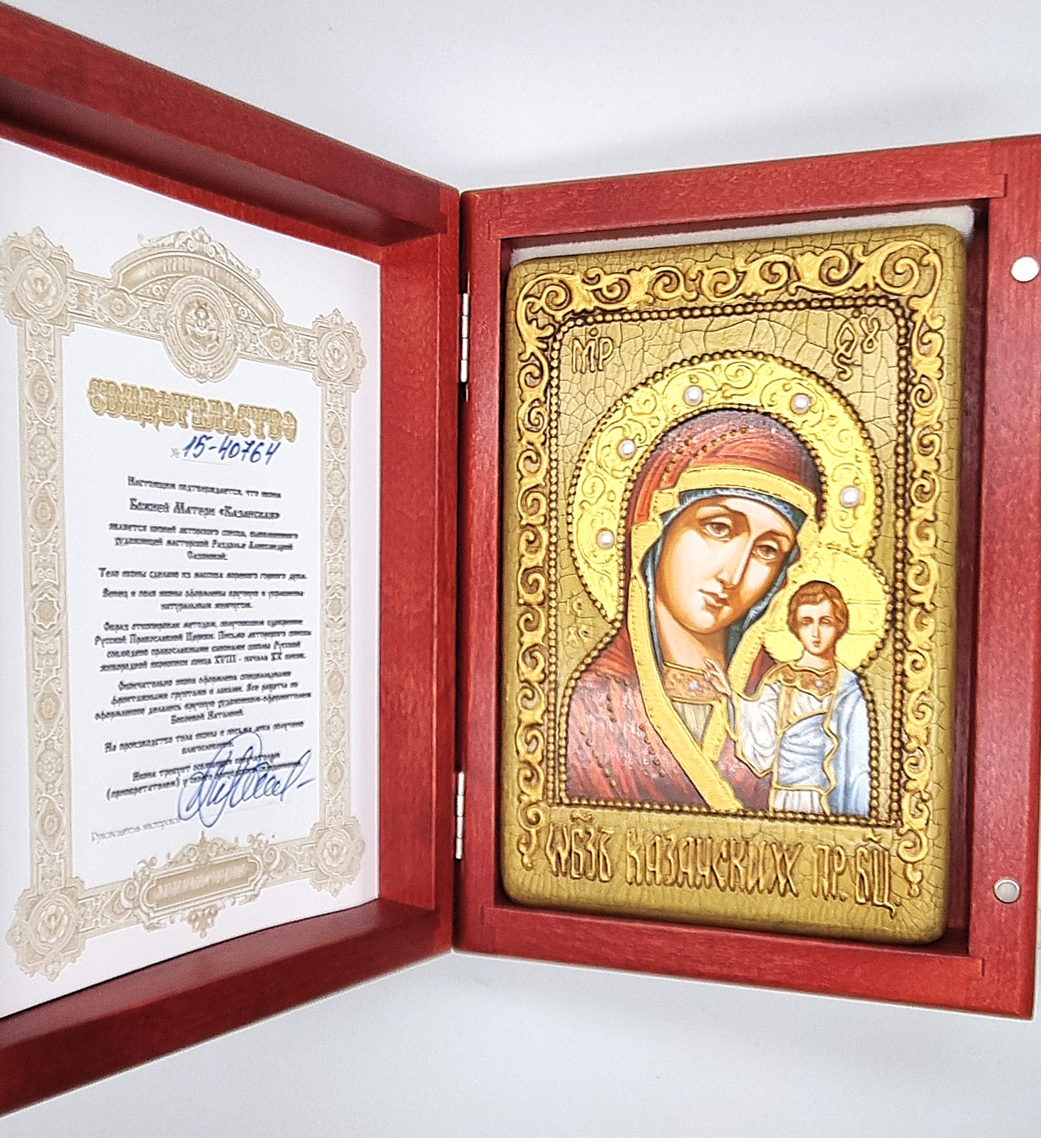 К каждой иконе прилагается номерное свидетельство с подробной информацией об изделии;