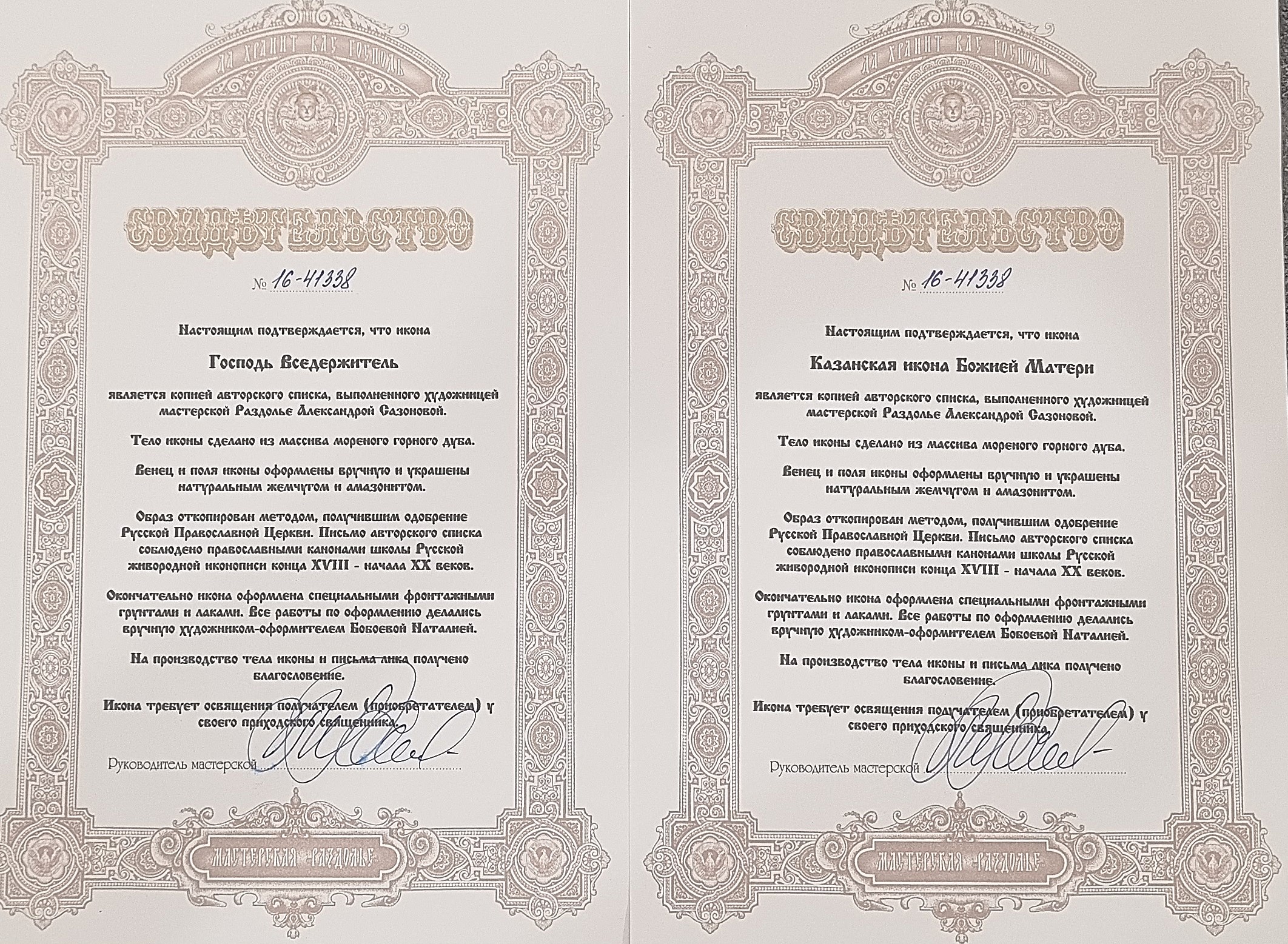 К каждой иконе прилагается номерное свидетельство с подробной информацией об изделии;