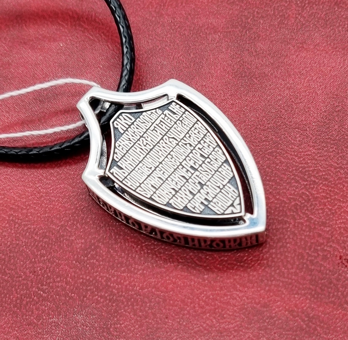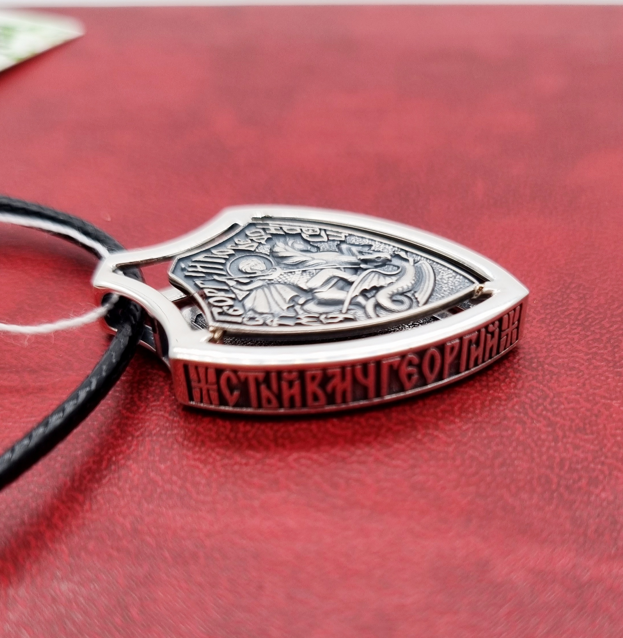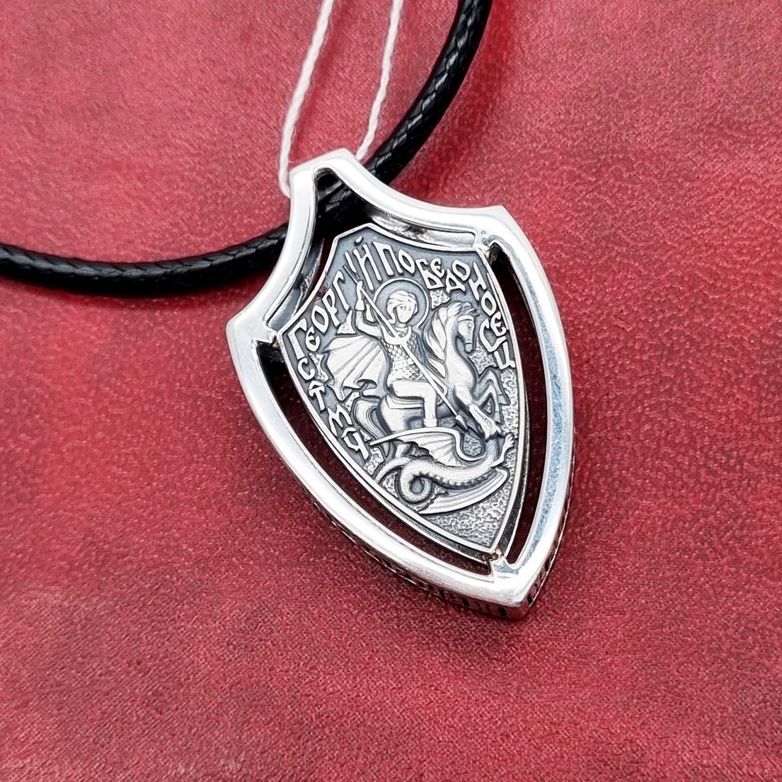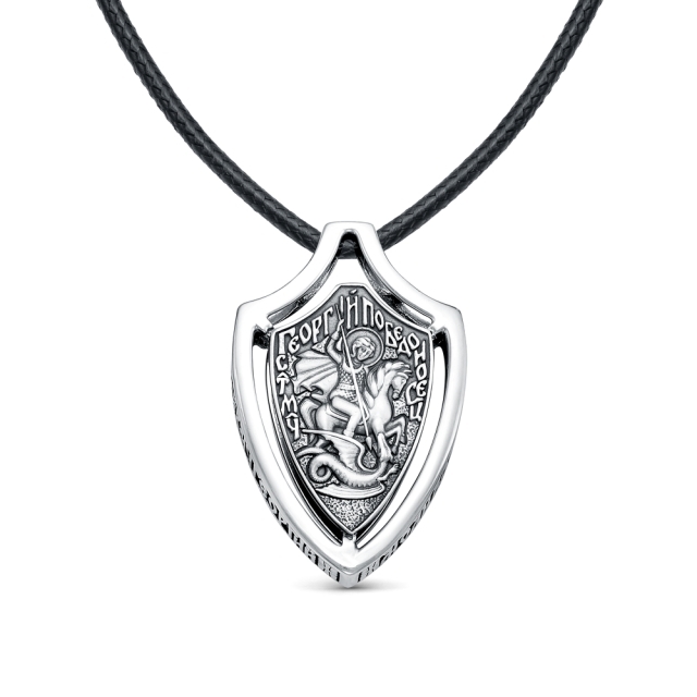 Подвес выполнен в форме щита с образом великомученика Георгия Победоносца. Комплектуется гайтаном на скользящих узлах.
