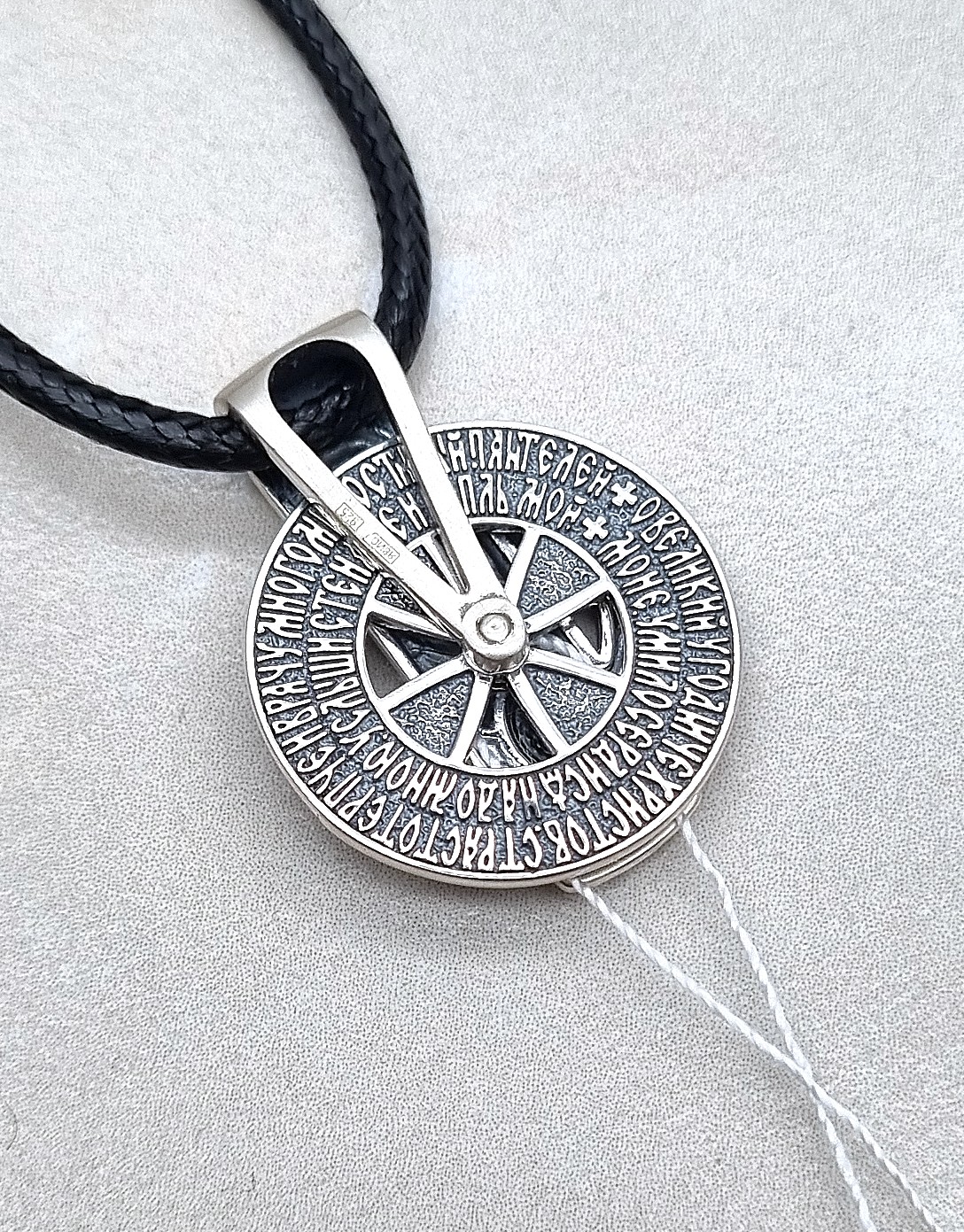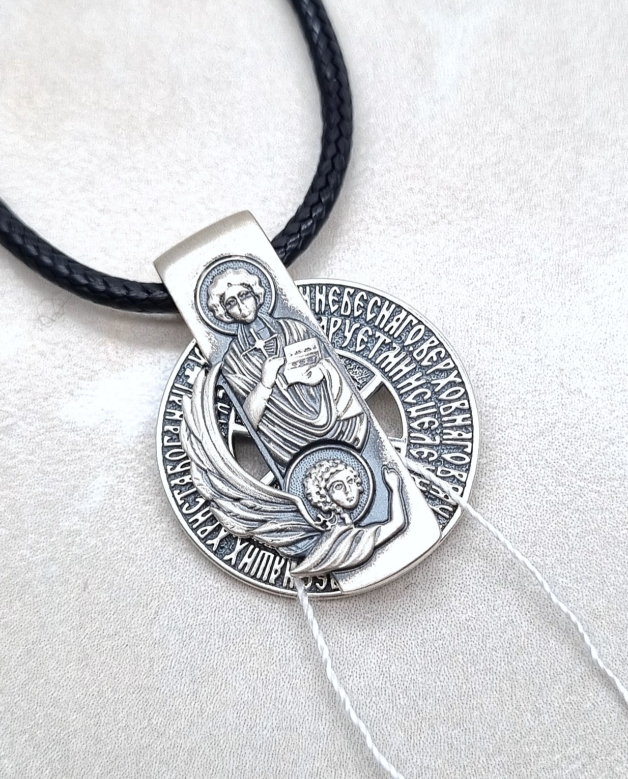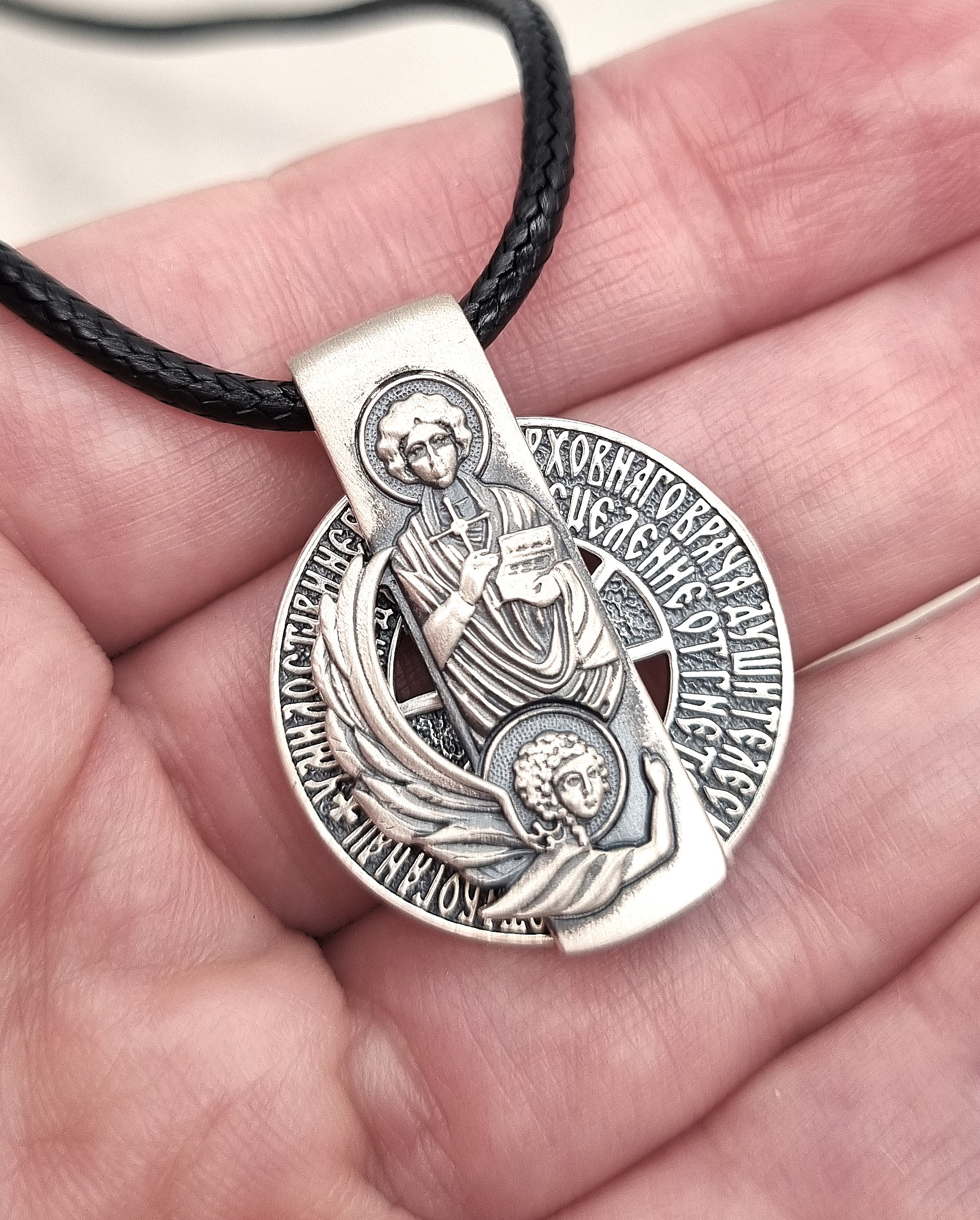 Православная подвеска из серебра выполнена в виде вращающейся круглой пластины с молитвой и пластины с образами Ангела - Хранителя и Пантелеймона Целителя. Святой помогает при недугах, дает сил для выздоровления. В молитвах к нему обращаются за выздоровлением для своих родных и близких. Центральная часть подвески выполнена в виде равностороннего креста.