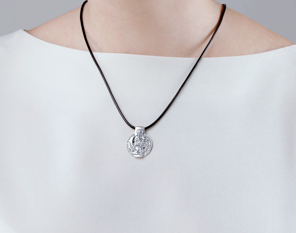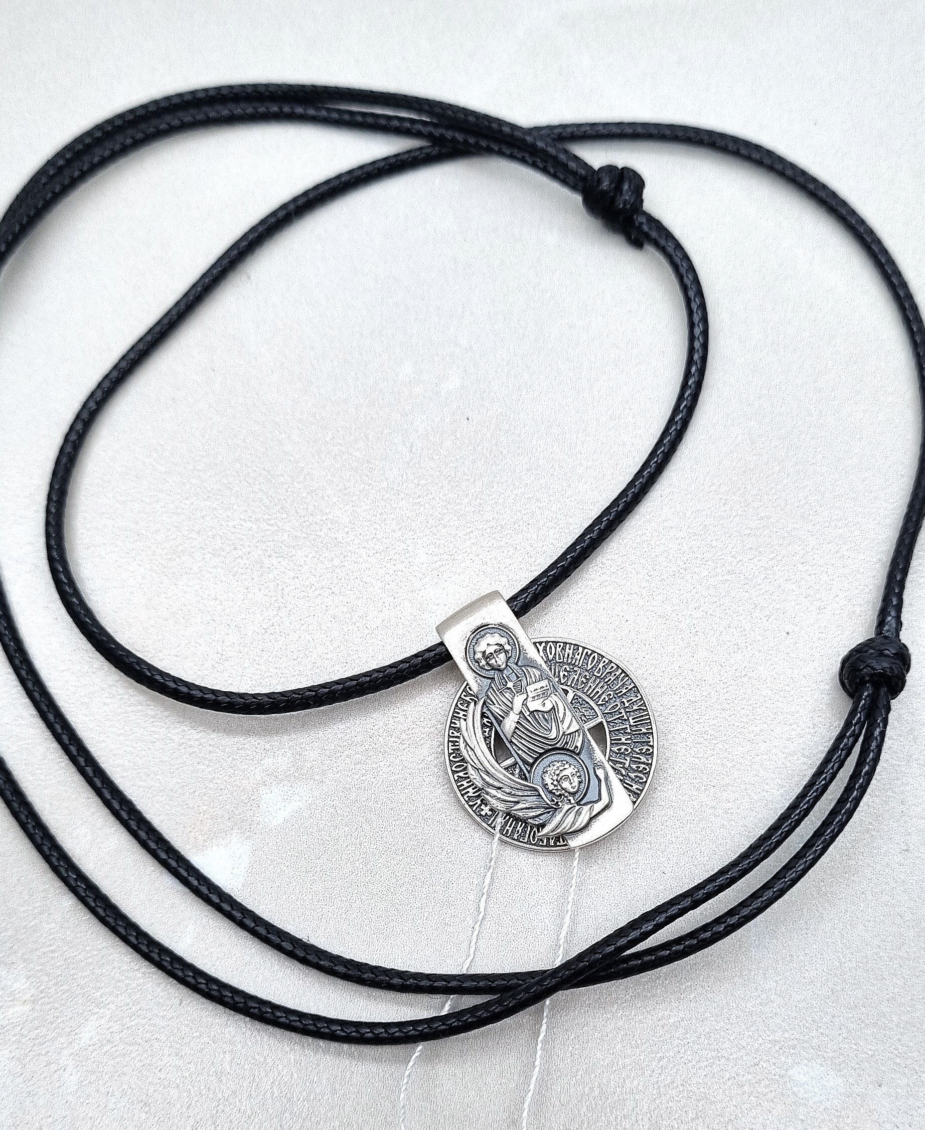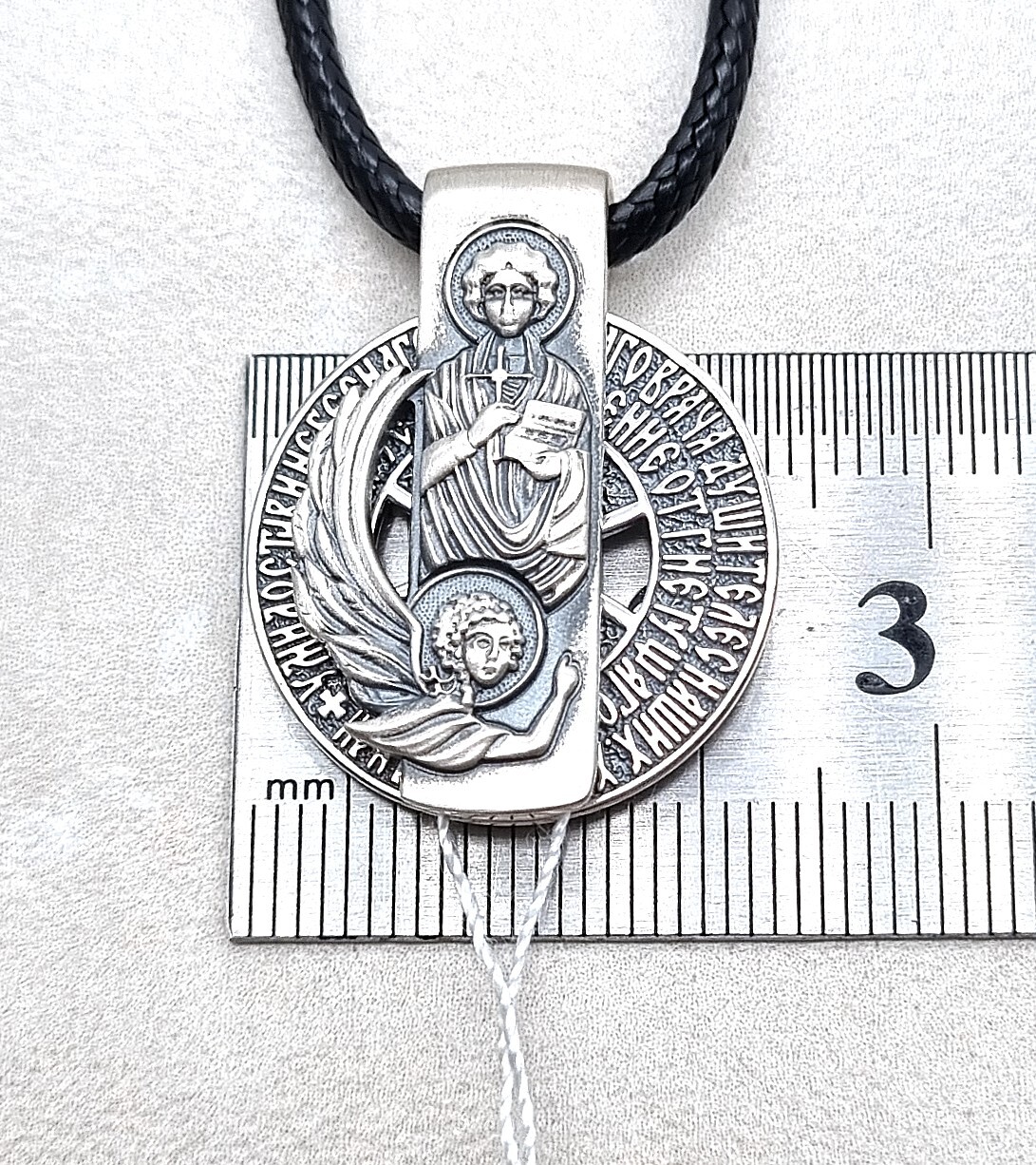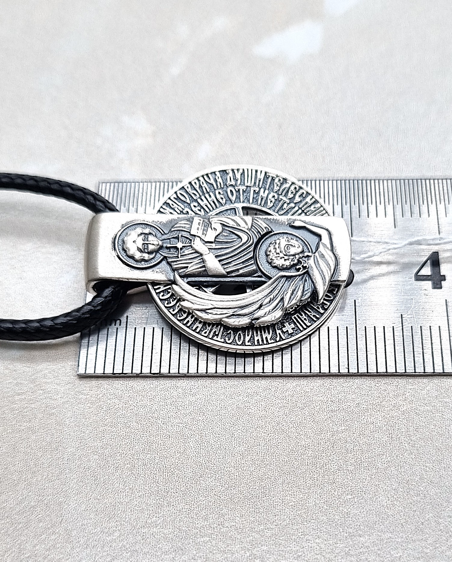 Православная подвеска из серебра выполнена в виде вращающейся круглой пластины с молитвой и пластины с образами Ангела - Хранителя и Пантелеймона Целителя. Святой помогает при недугах, дает сил для выздоровления. В молитвах к нему обращаются за выздоровлением для своих родных и близких. Центральная часть подвески выполнена в виде равностороннего креста.