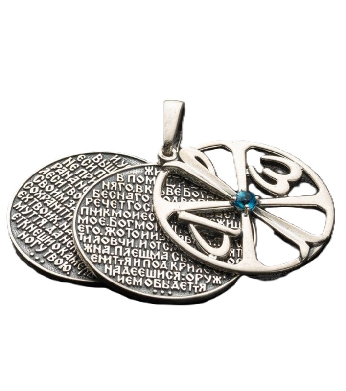 Серебряная трехсоставная подвеска «Ограждение Господне» с молитвой 90 псалма "Живый в помощи" с Хризмой и фианитом. Внутренний размер уха 6 * 3 мм. Освящено.