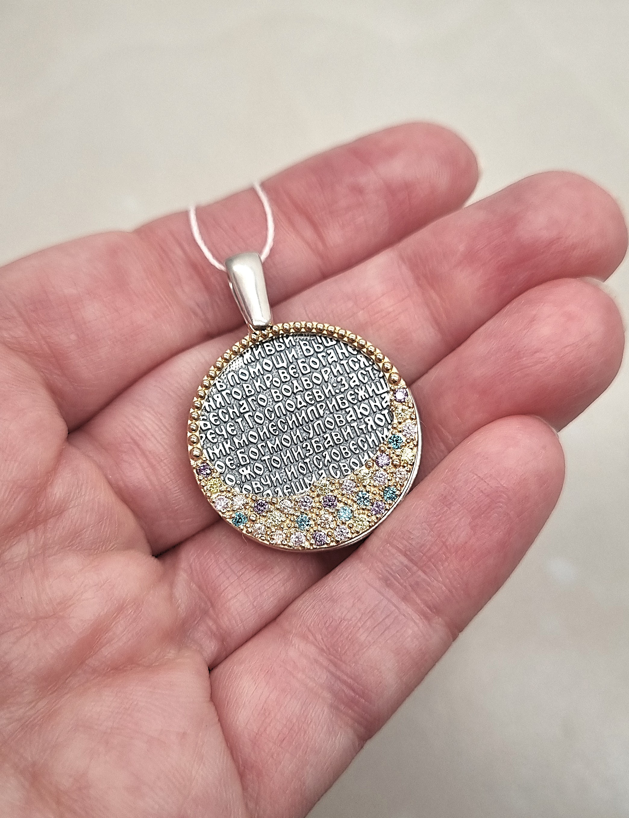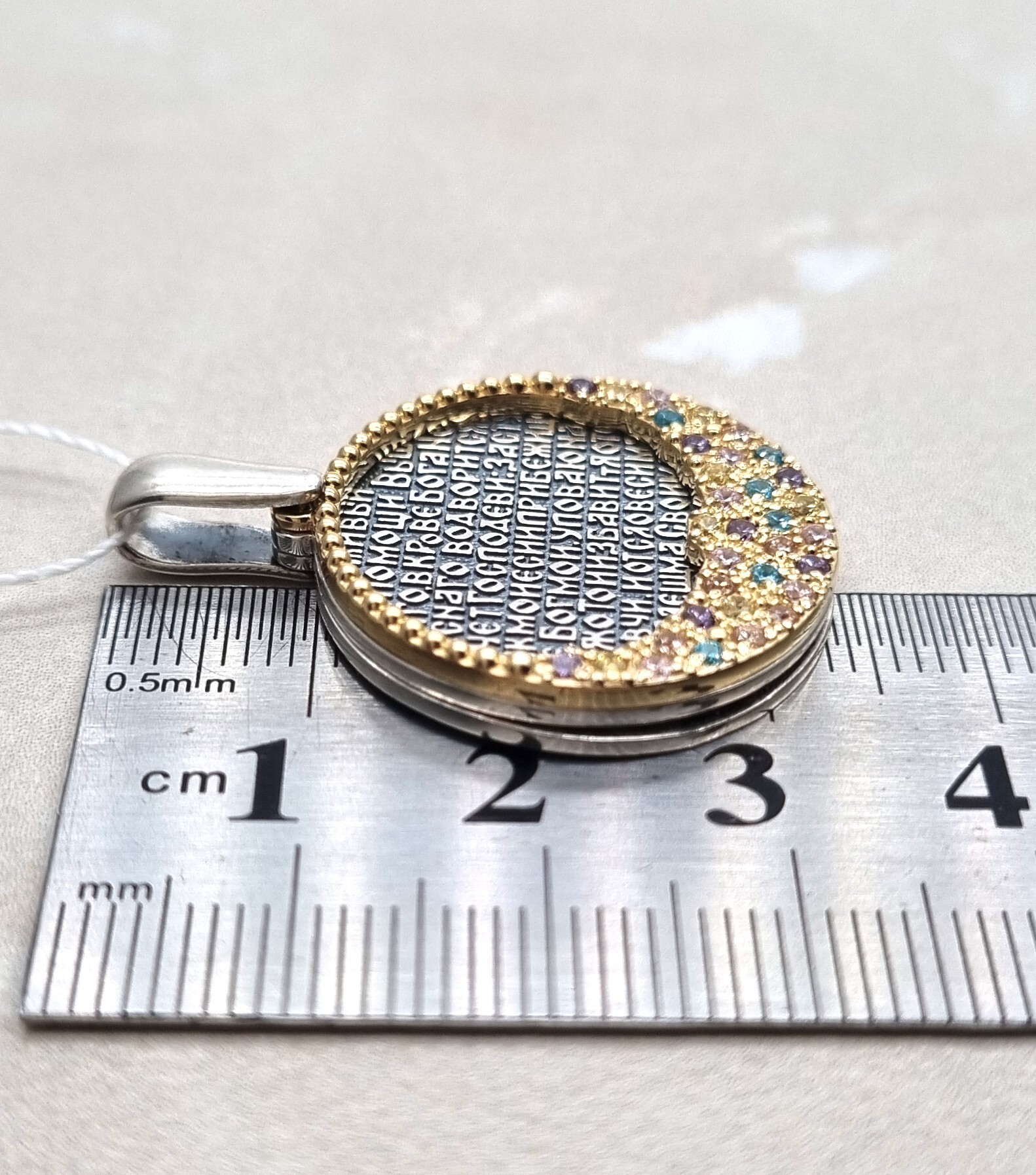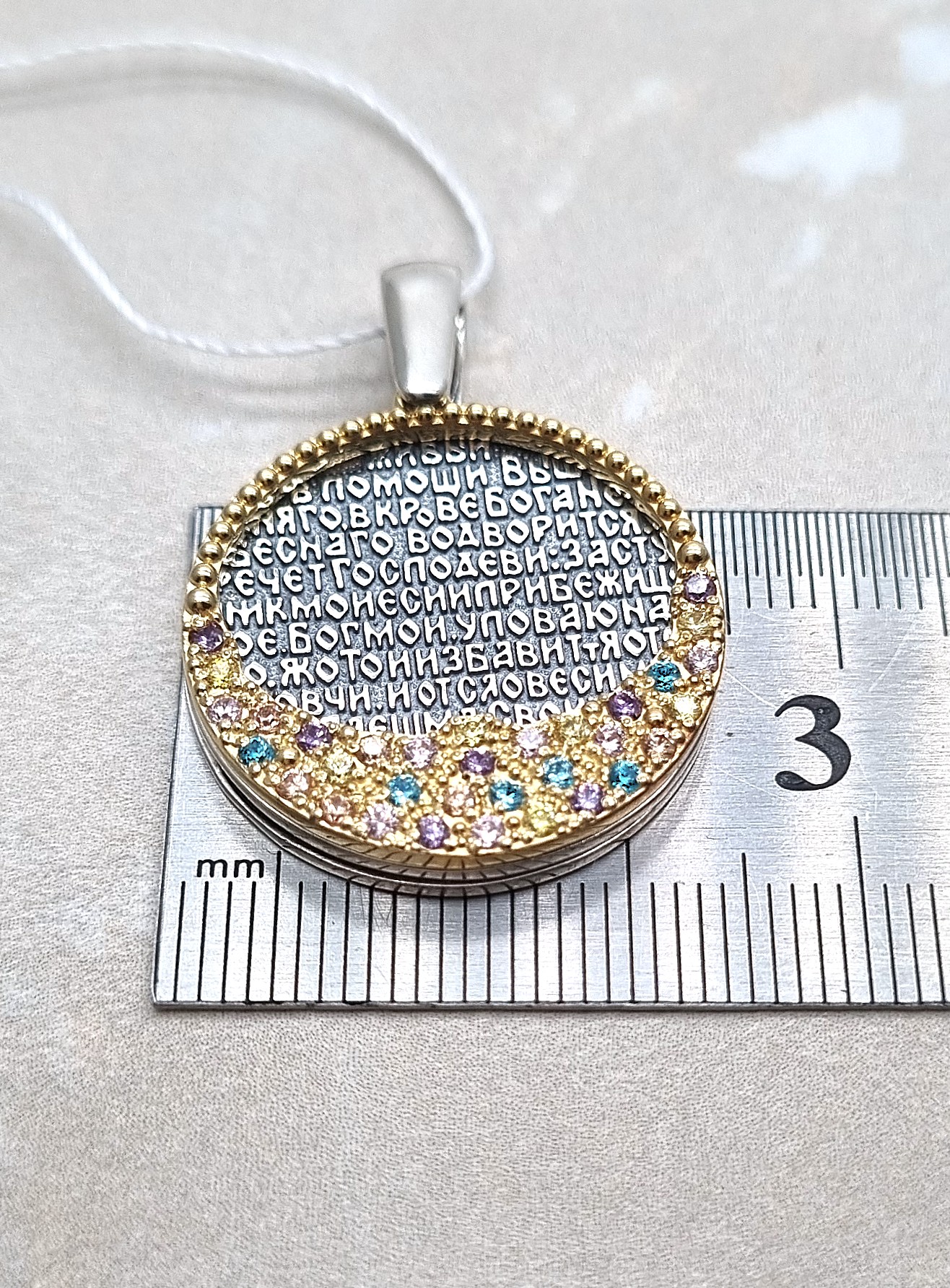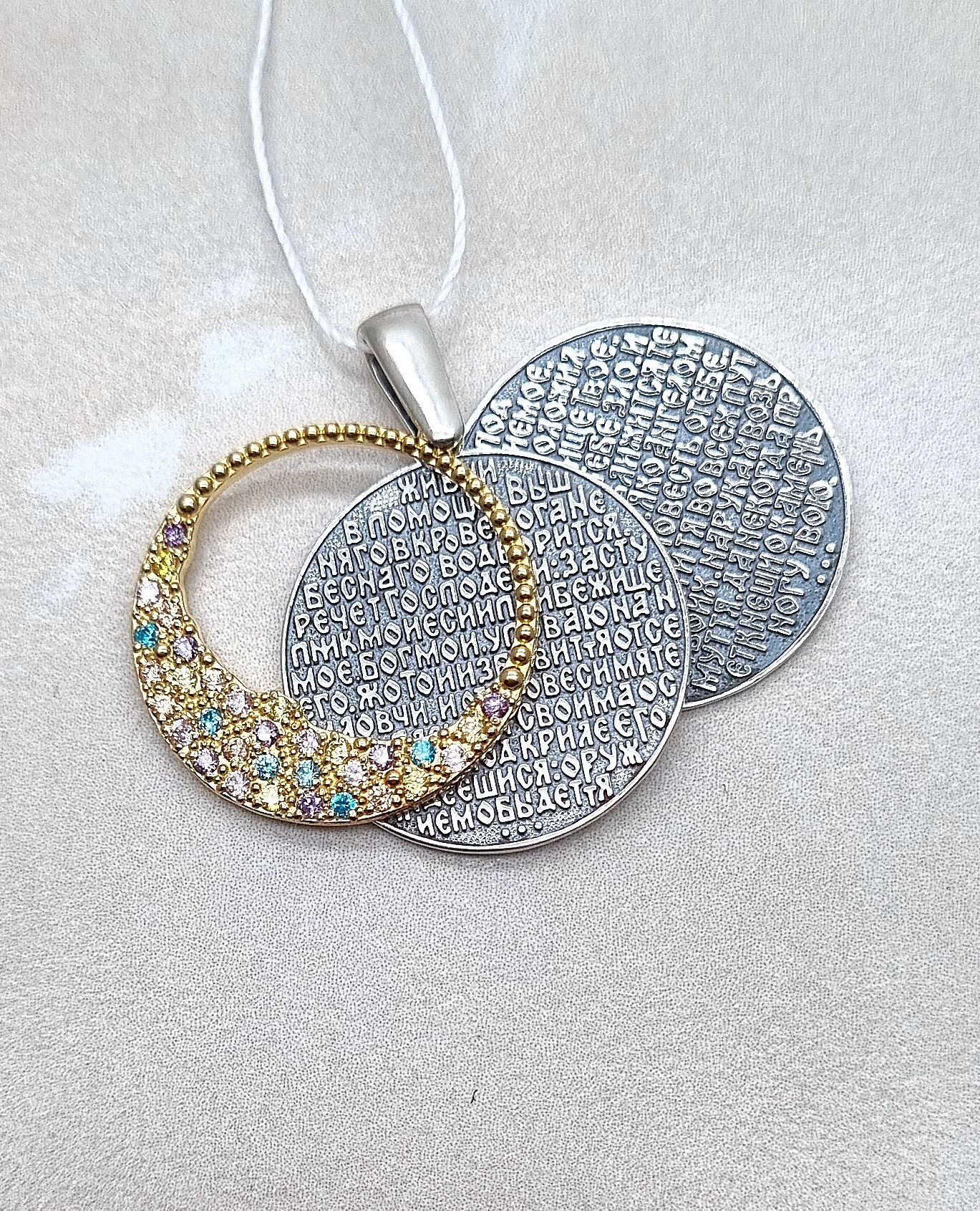 Серебряная трехсоставная подвеска «Сила и надежда» с молитвой 90 псалма "Живый в помощи" разноцветными фианитами. Внутренний размер уха 6 * 3 мм. Освящено.