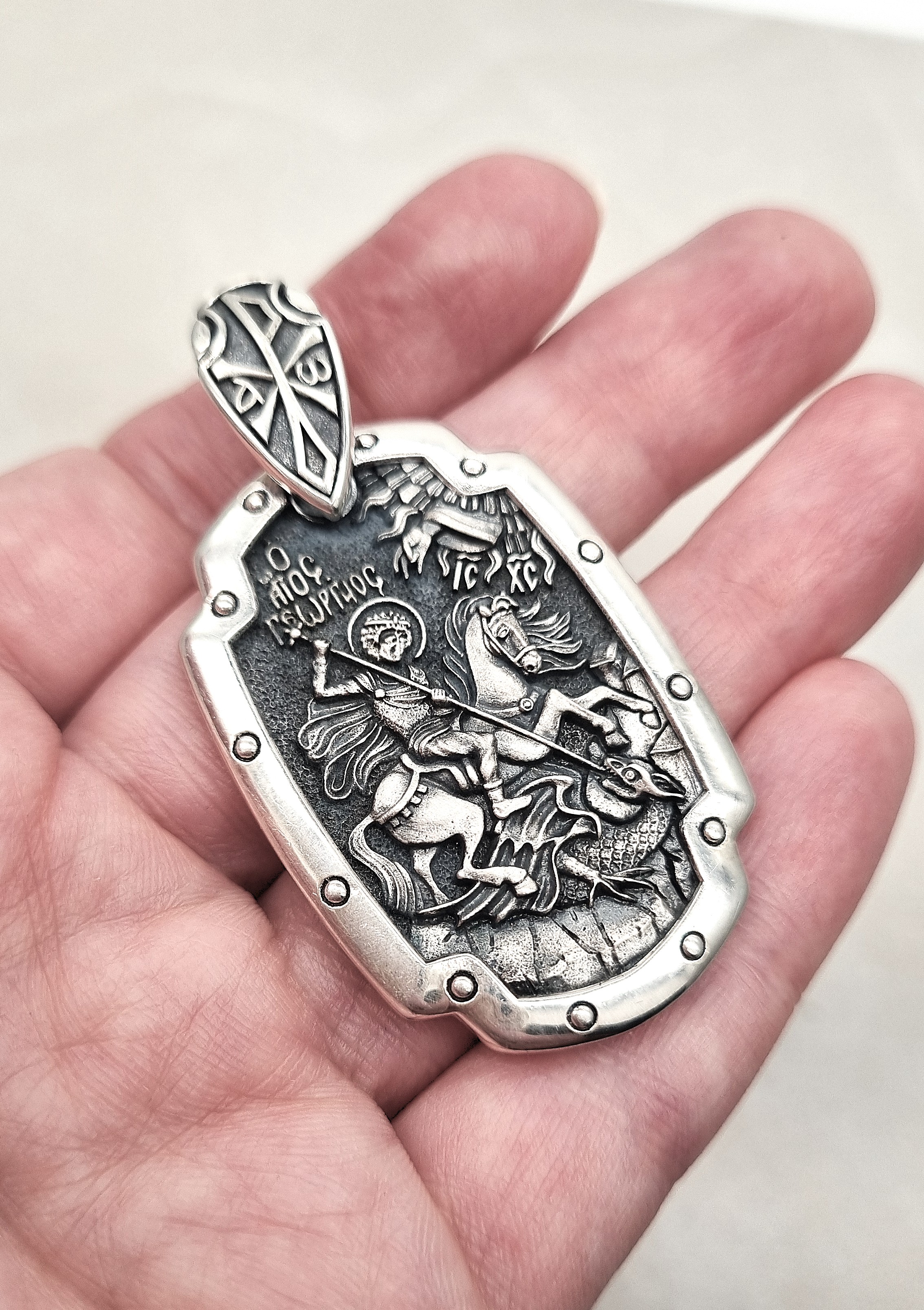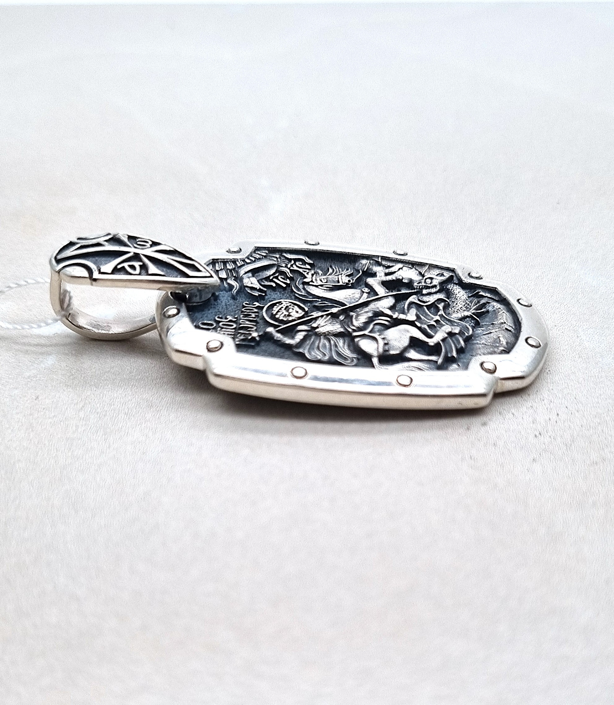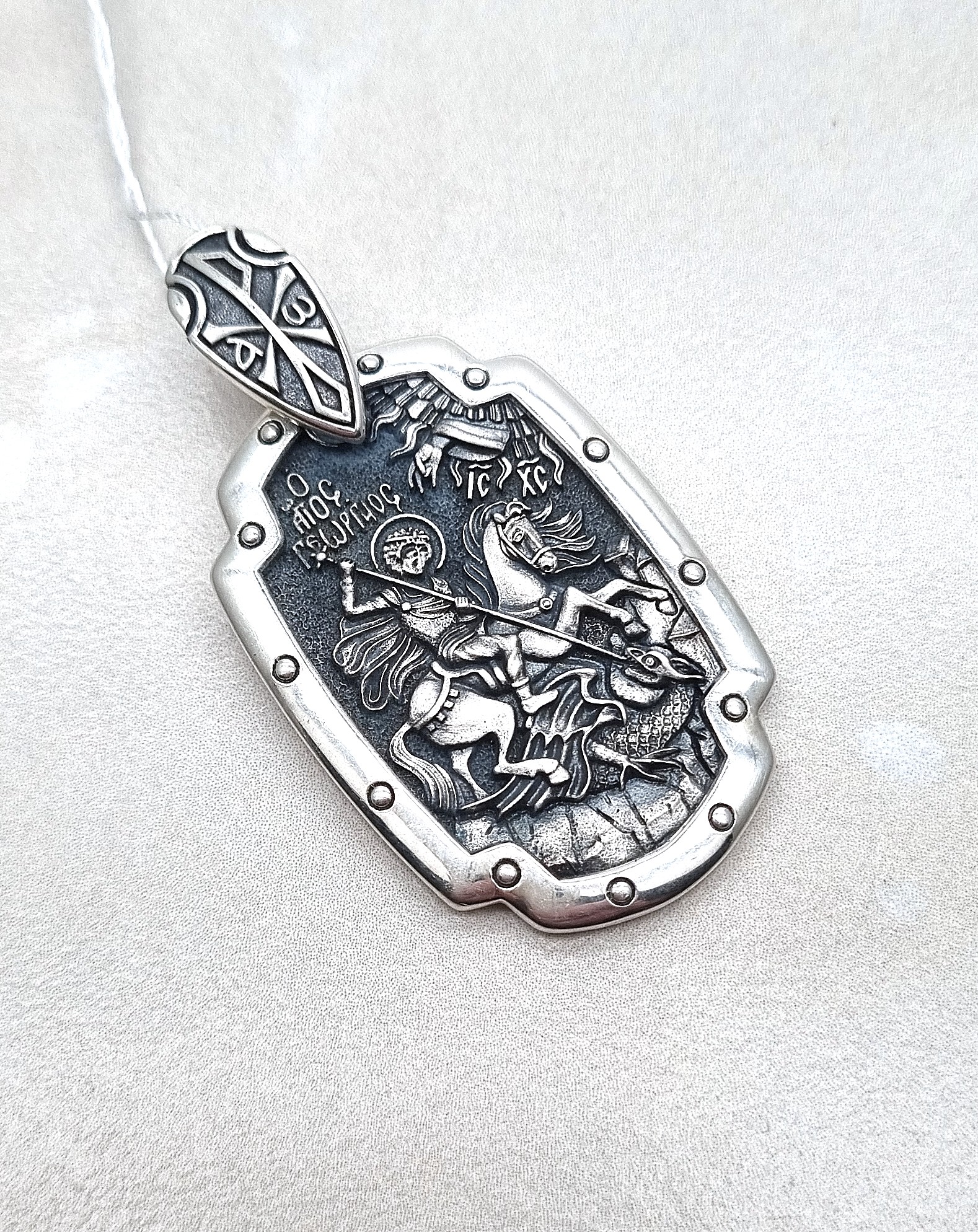На подвеске изображён святой Георгий на коне, поражающий змея — древний образ победы добра над злом, веры над страхом. Над святым виден перст Бога, указывающий на Его благословение и поддержку праведного подвига. На оборотной стороне выгравирована молитва, обращённая к святому Георгию: “О всехвальный, святый великомучениче и чудотворче Георгие! Призри на ны скорою твоею помощию, и умоли Человеколюбца Бога, да не осудит нас, грешных, по беззакониям нашим, но да сотворит с нами по велицей Своей милости…” Эта подвеска несёт глубокий смысл, напоминая о силе молитвы, мужестве и вере, которые помогают преодолевать жизненные испытания. Подвеска выполнена в виде щита, дарующего вам защиту, и украшена хризмой — монограммой имени Спасителя, которая считается христианским знаком победы. На оборотной стороне подвески выгравирована молитва к святому