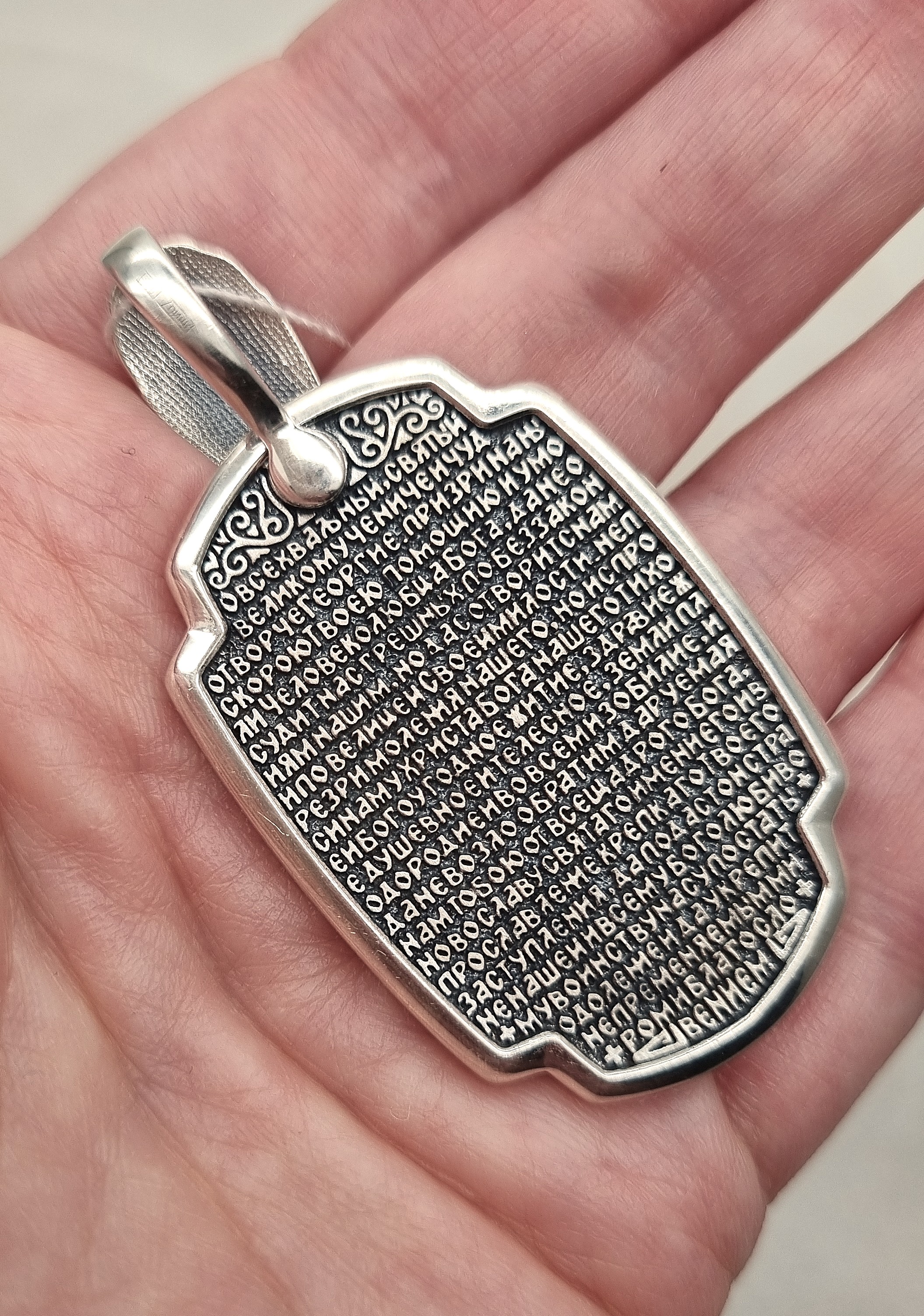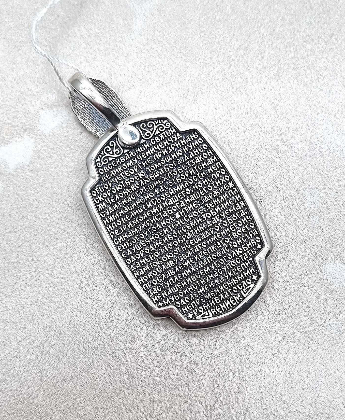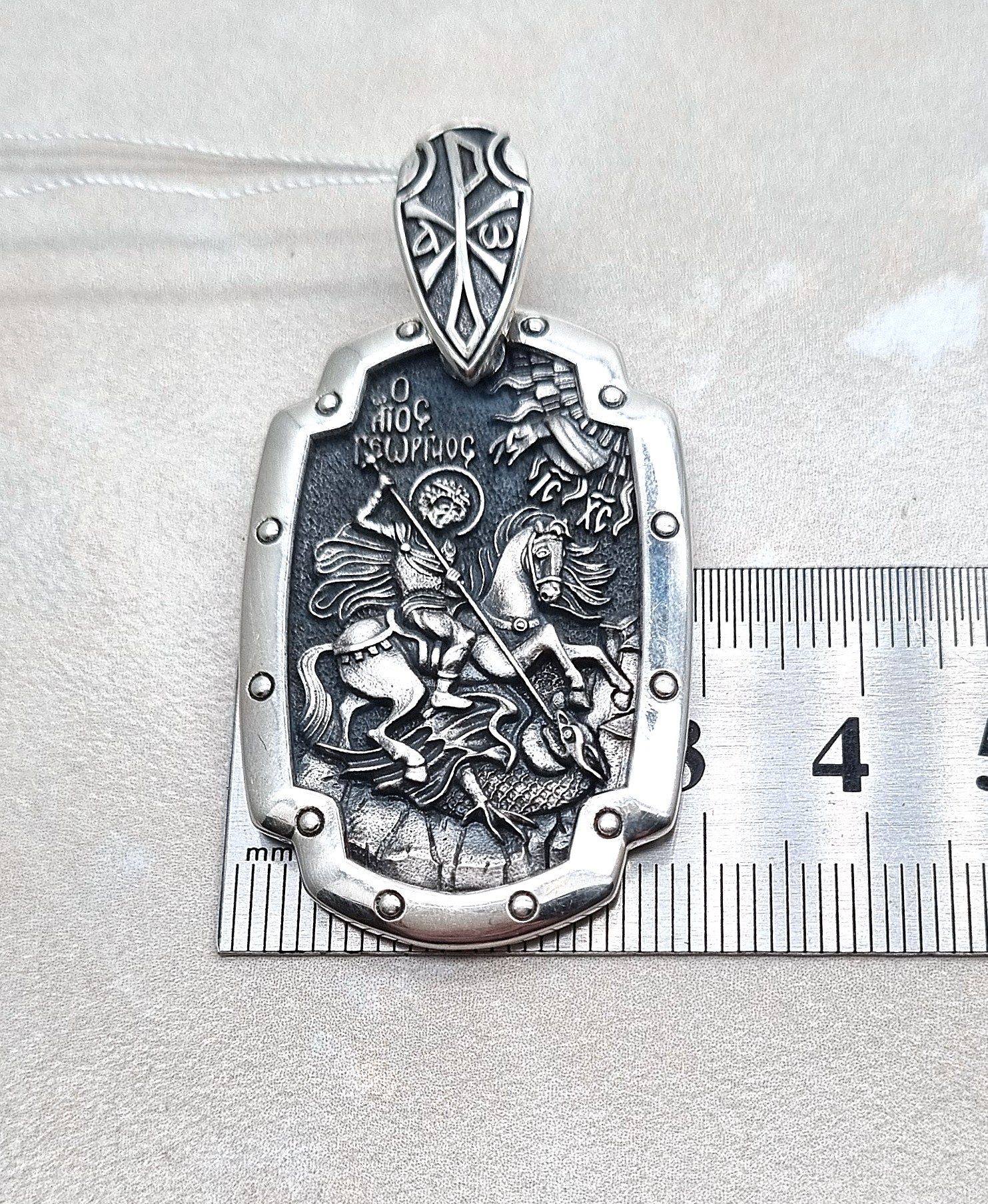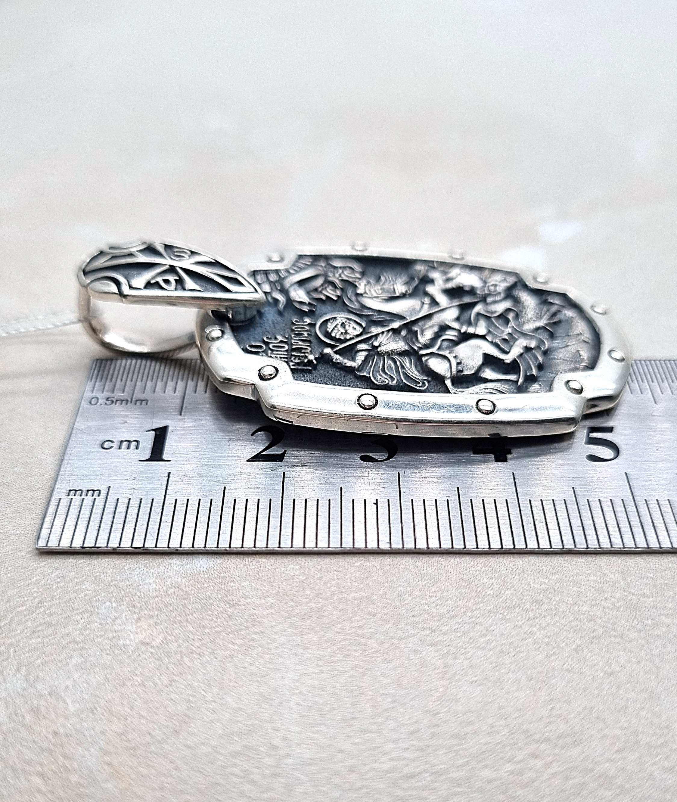 На подвеске изображён святой Георгий на коне, поражающий змея — древний образ победы добра над злом, веры над страхом. Над святым виден перст Бога, указывающий на Его благословение и поддержку праведного подвига. На оборотной стороне выгравирована молитва, обращённая к святому Георгию: “О всехвальный, святый великомучениче и чудотворче Георгие! Призри на ны скорою твоею помощию, и умоли Человеколюбца Бога, да не осудит нас, грешных, по беззакониям нашим, но да сотворит с нами по велицей Своей милости…” Эта подвеска несёт глубокий смысл, напоминая о силе молитвы, мужестве и вере, которые помогают преодолевать жизненные испытания. Подвеска выполнена в виде щита, дарующего вам защиту, и украшена хризмой — монограммой имени Спасителя, которая считается христианским знаком победы. На оборотной стороне подвески выгравирована молитва к святому